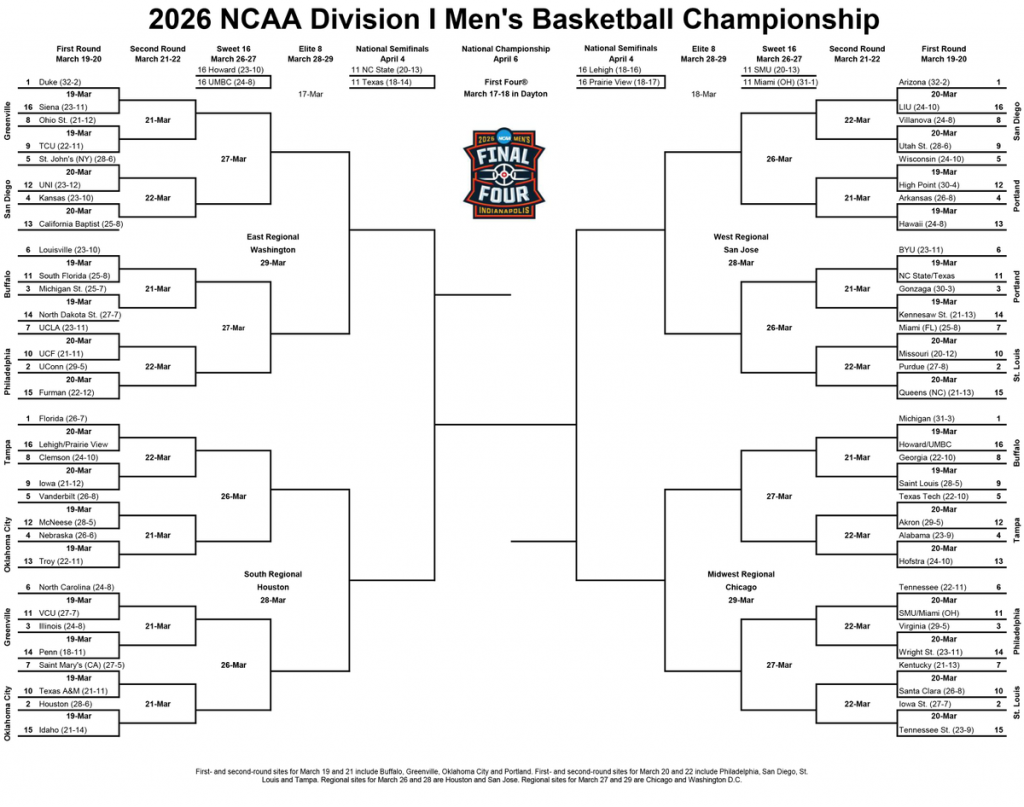 Here is the official, printable 2026 NCAA tournament bracket for March Madness and the DI men’s basketball tournament. You can get the full schedule below.
