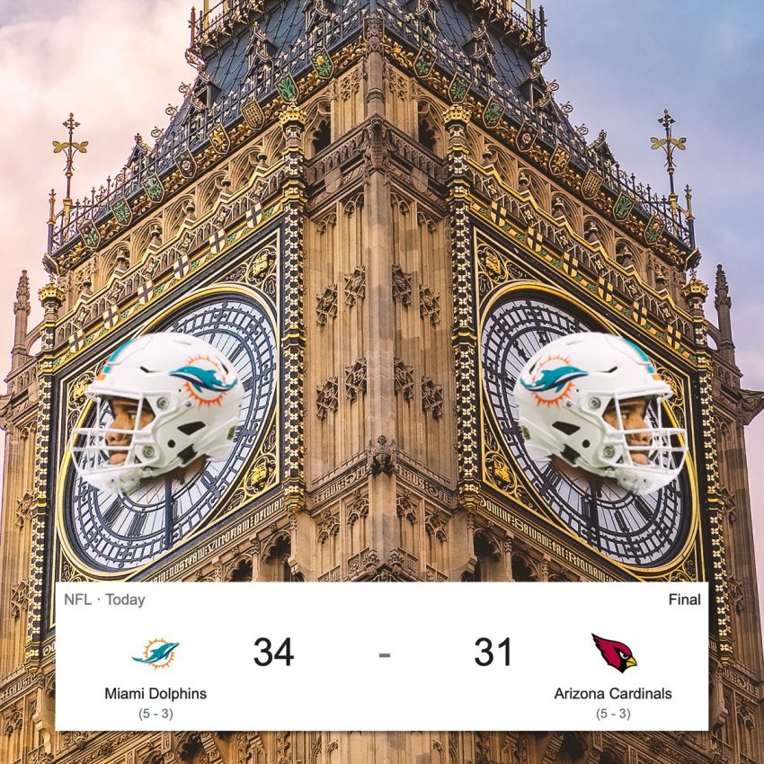 Miami improves to 5-3, winning for consecutive games and keeping pace with the Bills in the AFC East. The Cardinals fail to gain ground on the Seahawks and fall to 5-3, still a young team finding their wings.