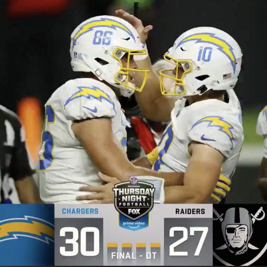 Rookie quarterback Justin Herbert led the Los Angeles Chargers to a dramatic 30-27 overtime win against the Las Vegas Raiders on Thursday night.