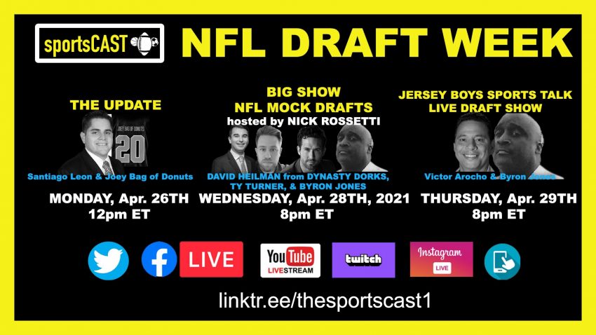 Then, the Big Show NFL Mock Drafts on Wednesday April 28th at 8pm ET hosted by Nick Rossetti, panelists David Heilman from Dynasty Dorks, and Sports Cast contributors Ty Turner and Byron Jones.