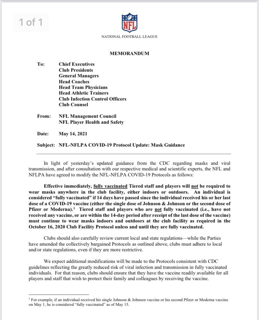 In a memo sent to clubs on Friday, the league and the NFL Players Association made the modification after consulting with their medical and scientific experts. Players and tiered staff who haven’t been fully vaccinated must continue to wear masks until they receive it, if they plan to get it.