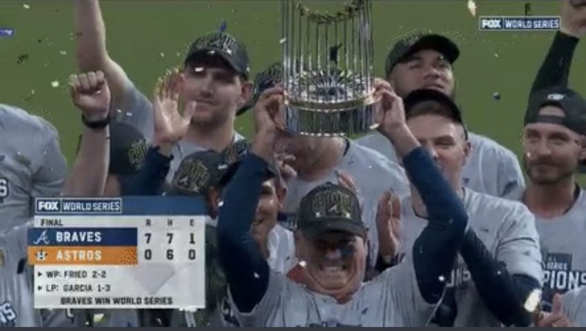 The 2021 Atlanta Braves win the World Series by beating the Houston Astros 7-0 and winning the series in six.