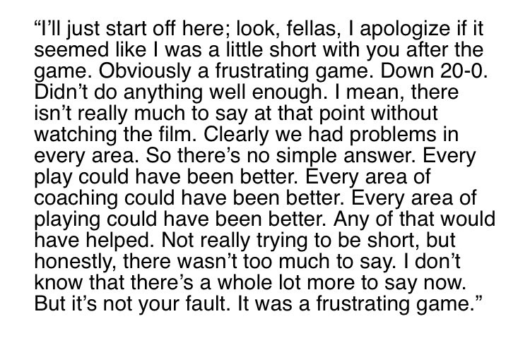 “I’ll just start off here. Look fellas, I apologize if it seemed like I was a little short with you after the game,” Belichick said to the media Monday morning (via ESPN’s Mike Reiss). “Obviously a frustrating game. Down 20-0. Didn’t do anything well enough. I mean, there isn’t really much to say at that point without watching the film.