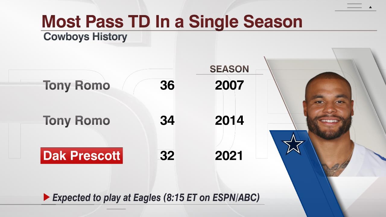 Dak Prescott can pass Tony Romo for the most Pass TD in a single season in Cowboys history Saturday night at the Eagles (8:15 ET on ESPN/ABC/ESPN+).