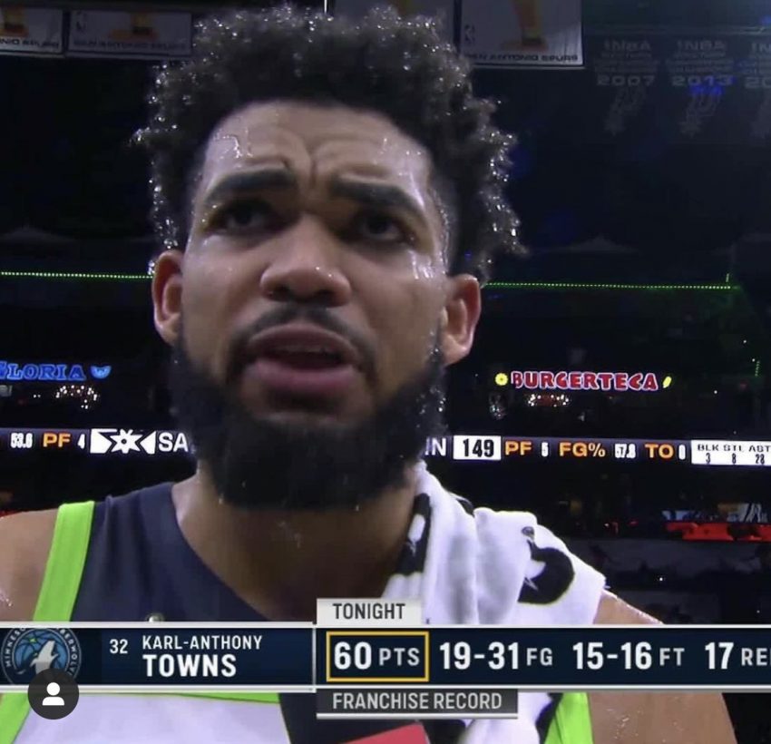 Karl-Anthony Towns recorded the highest individual score in the NBA this season with 60 points for the Minnesota Timberwolves as they overcame the San Antonio Spurs 149-139.