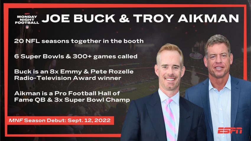 “When you have the opportunity to bring in the iconic, longest-running NFL broadcasting duo, you take it, especially at a time when we are on the cusp of a new era in our expanding relationship with the NFL,” said Jimmy Pitaro, Chairman, ESPN and Sports Content. “The NFL continues to ascend, and we now have more games than ever before, providing additional opportunities for Joe, Troy and our deep roster of commentators.”
