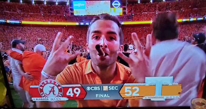 Tennessee put an end to 15 years of misery at the hands of Alabama on Saturday as the No. 6 Volunteers upset the No. 3 Crimson Tide 52-49 at Neyland Stadium for Tennessee’s first win in the rivalry since 2006. Vols kicker Chase McGrath drilled a 40-yard field goal as time expired to lift his team to the rousing win. No one was more integral to UT’s success than wide receiver Jalin Hyatt, who caught a school-record five touchdowns as Tennessee improved to 6-0 with the victory.