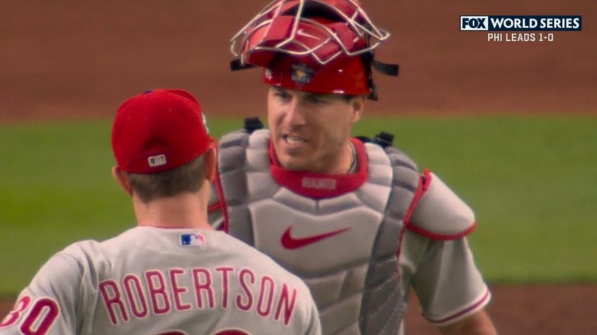 Down 5-0, Phillies score 5 off Verlander, get a game-saving Castellanos catch in the 9th, a Realmuto homer in the 10th and a wobbly Robertson save to win Game 1 of the World Series.