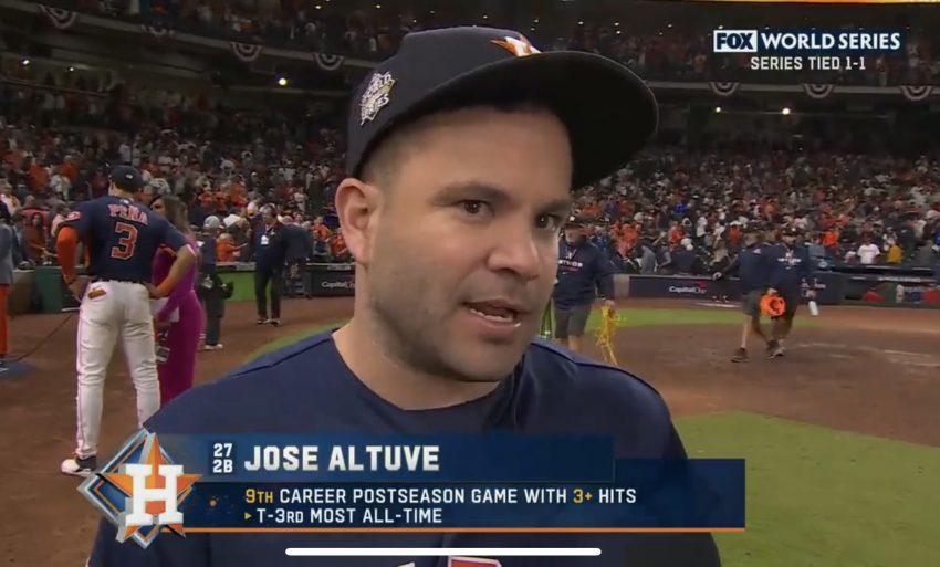 World Series evened up! ⚾🔥 Framber Valdez was lights out for Houston, Jose Altuve had three hits and Alex Bregman went deep as the Astros beat Philadelphia, 5-2, evening the World Series at a game apiece! #LevelUp #Astros https://t.co/SMMYqIHfBt pic.twitter.com/84y9f51luc