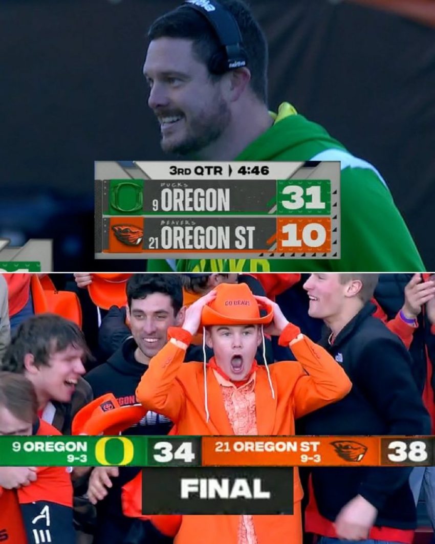 Oregon had a 21-point lead with 4:46 remaining in the third quarter, but allowed Oregon State to storm back and win 38-34 in stunning fashion.