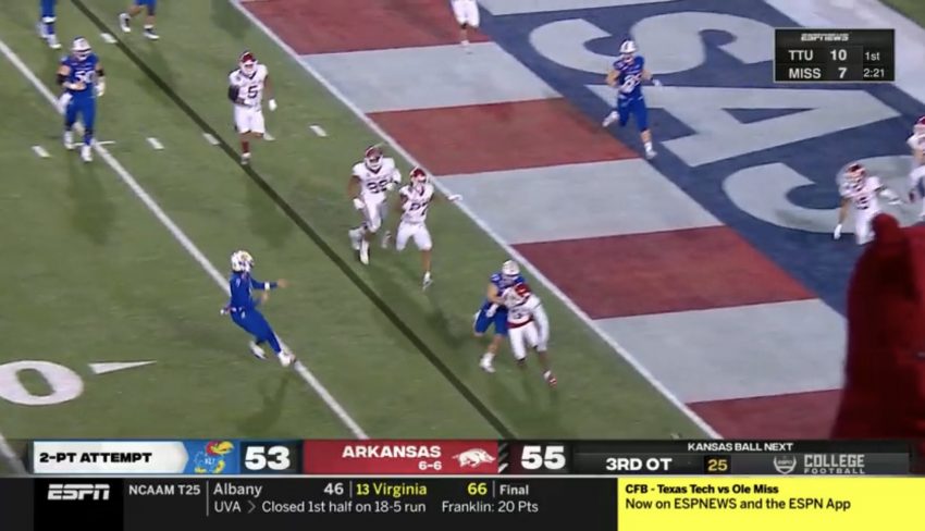 The Razorbacks (7-6) led 38-13 at one point in the third quarter and led by 18 points in the fourth. But Kansas (6-7) got the game to overtime before KJ Jefferson hit Rashod Dubinion out of the backfield for the winning two-point conversion.