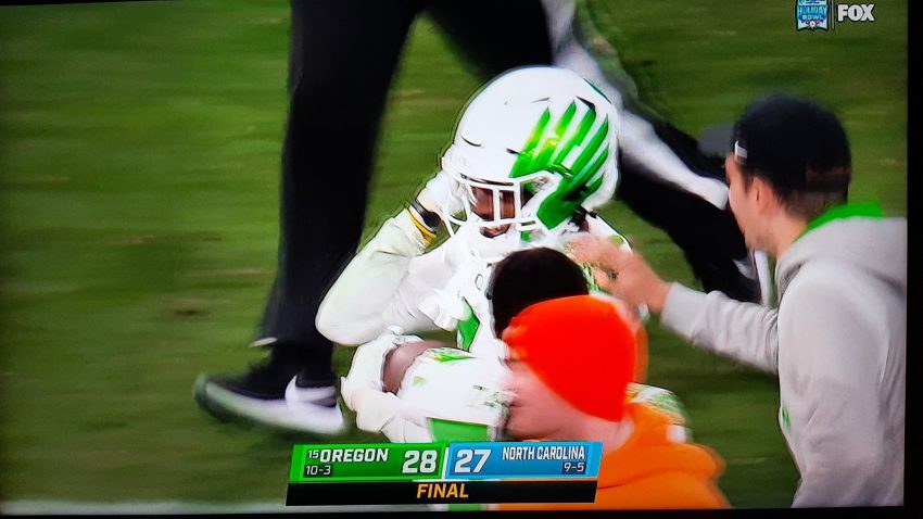 Bo Nix threw a 6-yard touchdown pass to Chase Cota on fourth down with 19 seconds left and Camden Lewis’ PAT bounced off the left upright and went through to give No. 15 Oregon a wild 28-27 victory against North Carolina on Wednesday night at Petco Park.