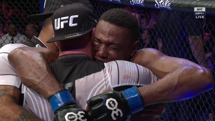 Hill, being embraced by his coaches, started crying and then yelling before the decision was even read by ring announcer Bruce Buffer, because he won in dominant fashion. He blasted Teixeira for five rounds with wicked punching combinations and head kicks, bloodying the former titleholder.