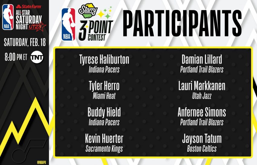 The Three-Point Contest participants at NBA All-Star Weekend will be Jayson Tatum, Buddy Hield, Tyrese Haliburton, Lauri Markkanen, Kevin Huerter, Tyler Herro, Damian Lillard, and Anfernee Simons, sources told The Athletic’s Shams Charania.