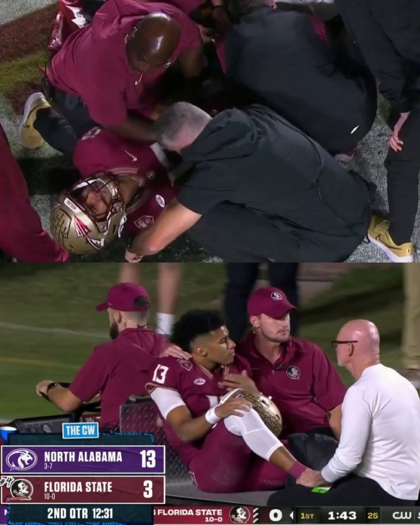 Florida State quarterback Jordan Travis was taken to a local hospital after being carted off in the first quarter of Saturday’s 58-13 victory against North Alabama following a gruesome left leg injury.