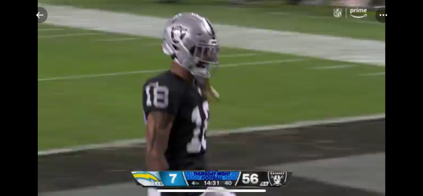 Eight different players scored a touchdown for the Raiders in the win, tied for the most by any team since the Los Angeles Rams in 1950. Tre Tucker was the only player to score multiple touchdowns for Vegas, as Zamir White, Jakobi Meyers, Michael Mayer, Davante Adams, Brandon Bolden, John Jenkins and Jack Jones also scored. Every player with a scrimmage touch scored a touchdown except for Ameer Abdullah.