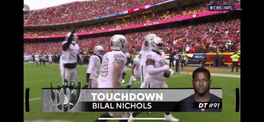 Big defensive tackle Bilal Nichols returned a fumble 8 yards for a touchdown, and Jack Jones took an interception 33 yards for another score 7 seconds later, helping the Raiders (7-8) snap a six-game losing streak to the Chiefs.