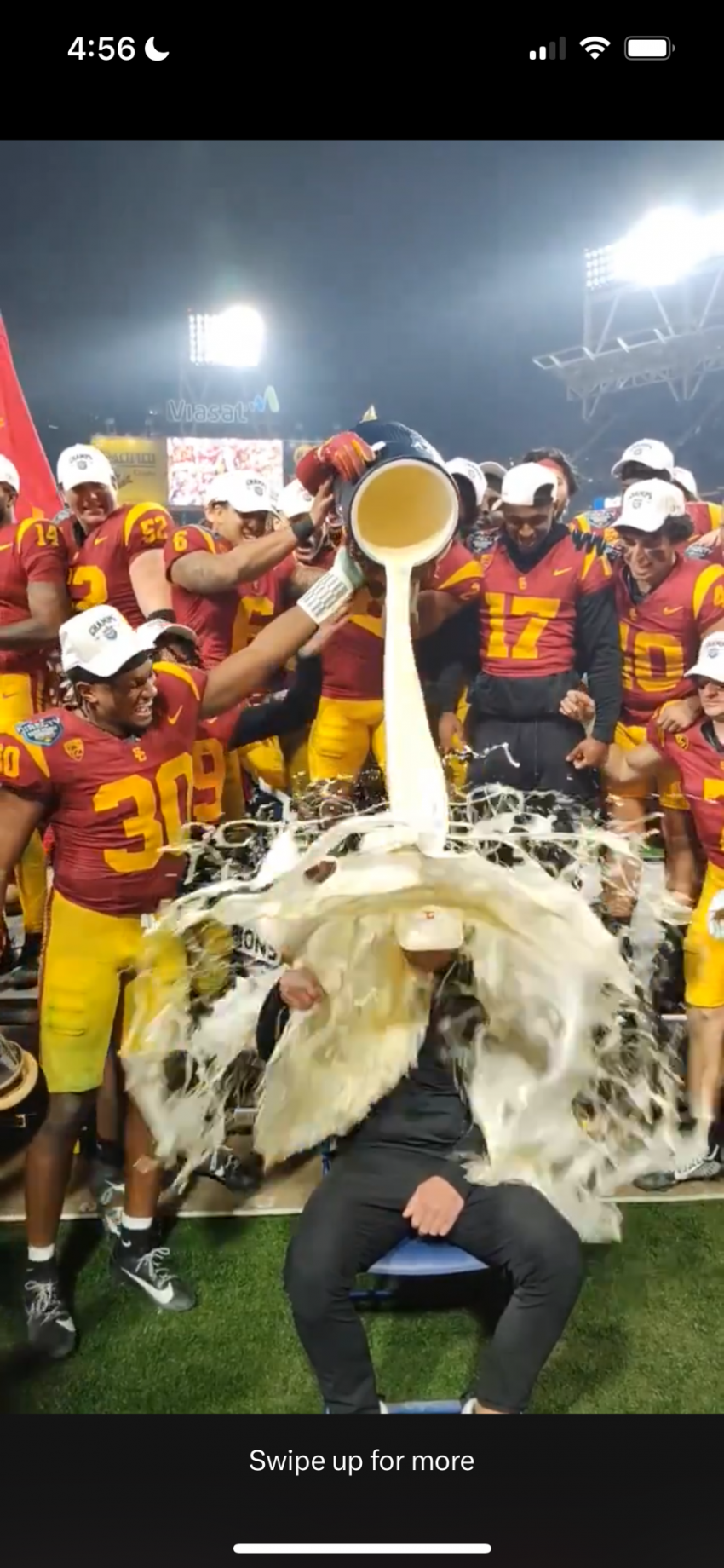 With Caleb Williams watching from the sideline, Miller Moss threw a Holiday Bowl-record six touchdown passes in his first college start and USC ended a frustrating season by beating No. 16 Louisville 42-28 Wednesday night. Afterward, coach Lincoln Riley had a tub of eggnog poured over his head.