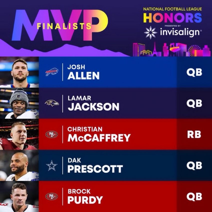 Dallas Cowboys passer Dak Prescott, San Francisco 49ers running back Christian McCaffrey, and 49ers signal-caller Brock Purdy round out the finalists for the accolade.