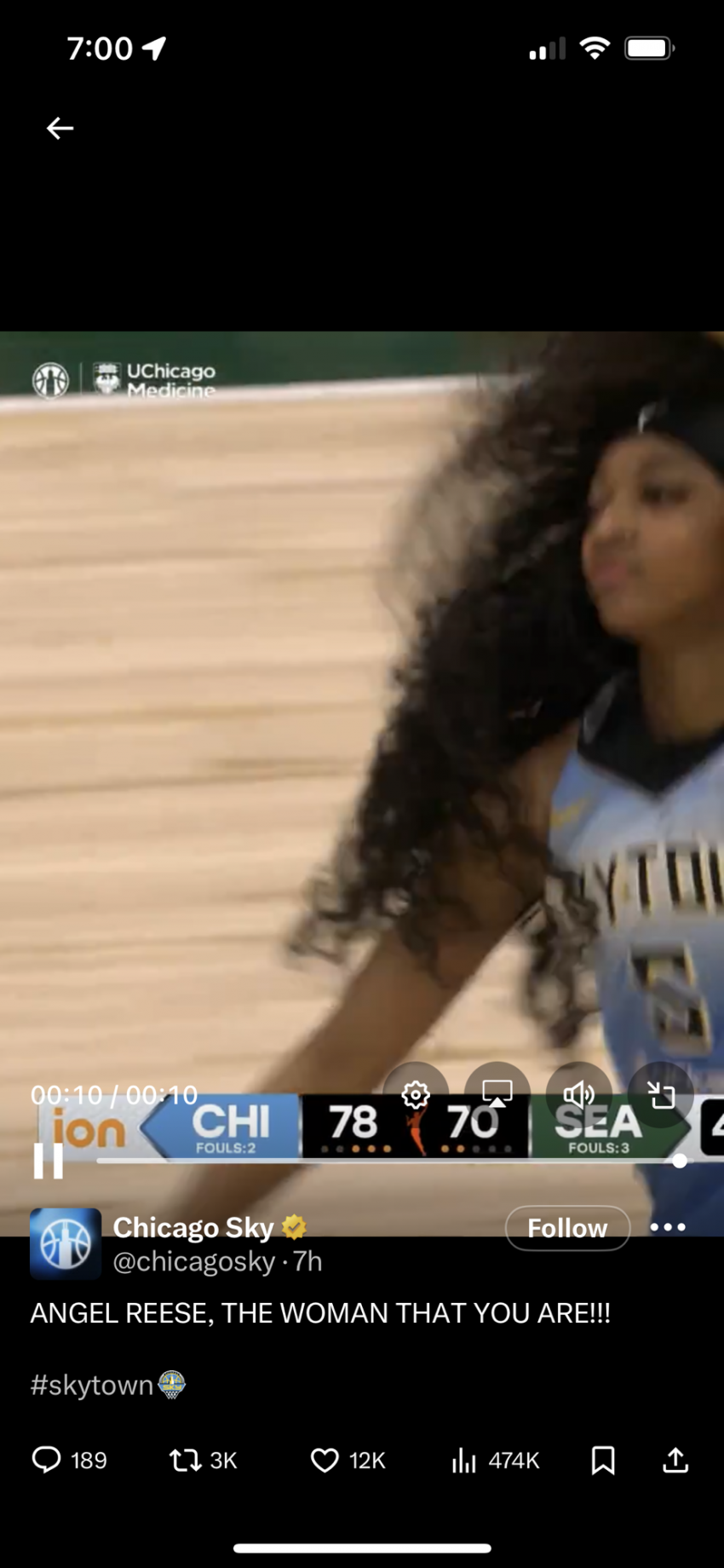 Reese hit a 3-pointer that gave Chicago (8-11) a 78-70 lead with 6:16 to play. Jewell Loyd hit a pull-up jumper and a tip-in putback to cut the deficit to four with 4 minutes remaining and Jordan Horston made a 3-pointer followed by back-to-back baskets by Ezi Magbegor pulled the Storm to 84-82 with 20.2 seconds left before Reese sealed it from the free-throw line.