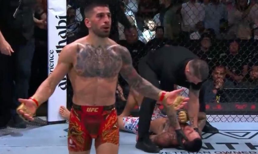 A little over a minute into the third round, Topuria knocked Holloway’s head back with a massive right hand, marking the beginning of the end. He swarmed Holloway with a barrage of punches to the head and body. Holloway circled away from Topuria, but just seconds later, Topuria came forward again, landed a few more shots, and then dropped Holloway with a left hook. Topuria landed a few hammerfists on the ground before referee Marc Goddard stepped in.