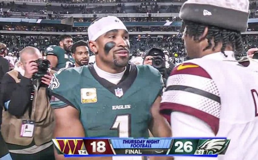 Jalen Hurts ran for the go-ahead score, Saquon Barkley rushed for 146 yards and two fourth-quarter touchdowns, and the Eagles stretched their lead in the NFC East with a 26-18 win Thursday night over Jayden Daniels and the Commanders.