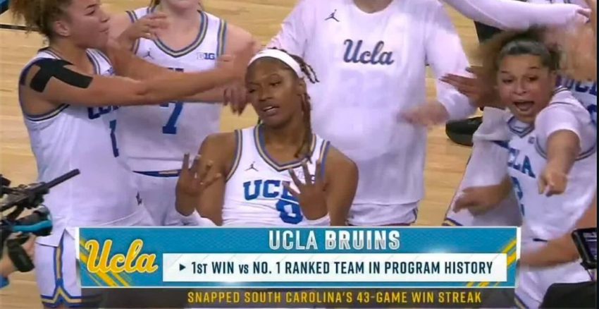 The Bruins knocked off South Carolina, the defending national champion that had held the top spot in the previous 23 polls, on Sunday with a dominant 77-62 victory that snapped UCLA’s 0-20 record against No. 1 teams. It came in front of a raucous, star-studded crowd, too.