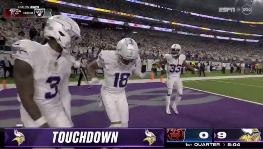 Justin Jefferson had seven catches for 73 yards, among them a touchdown from Sam Darnold in the first quarter that was set up by Jonathan Greenard’s sack and forced fumble on Caleb Williams.