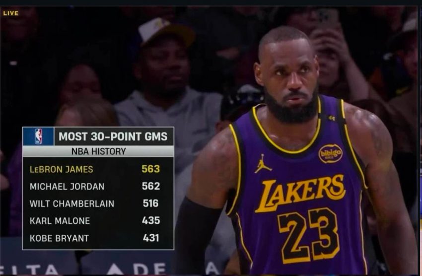 With an 18-foot jumper with 5:58 to play, James scored at least 30 points in the regular season for the 563rd time in his career, breaking the record established by Jordan in 2003. Jordan set the record in 1,072 career games over 15 seasons, while James broke the mark in his 1,523rd appearance over 22 seasons.