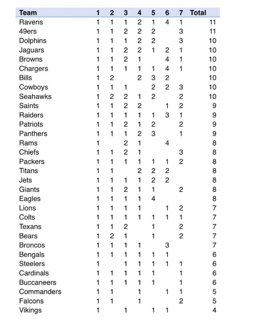 • Baltimore Ravens: Known for excelling in the draft, Baltimore has one of the most balanced spreads across all seven rounds, including multiple picks in Rounds 4 and 6.