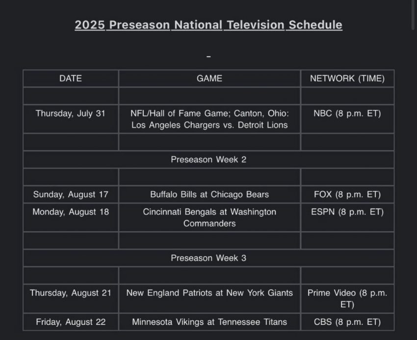 The NFL has officially unveiled the national television schedule for the 2025 preseason, providing fans with a slate of exciting matchups airing across major networks throughout August.