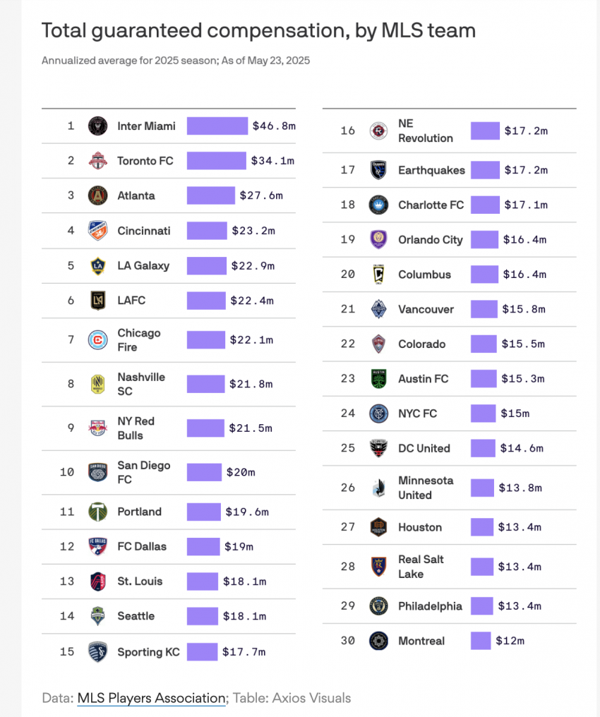 Major League Soccer’s salary landscape for the 2025 season reveals a widening gap between top-spending clubs and more budget-conscious teams. According to data released by the MLS Players Association, Inter Miami leads all teams in guaranteed compensation, shelling out an annualized $46.8 million, far surpassing the rest of the league.