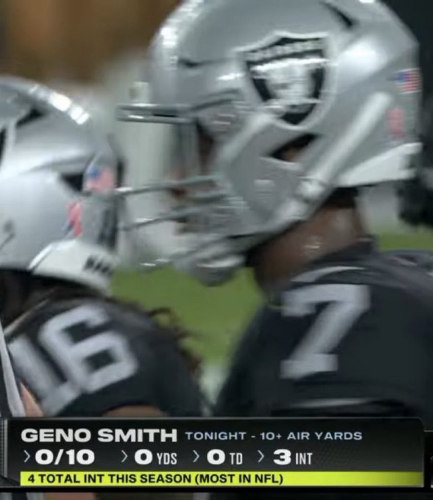 For the Raiders (1-1), Smith threw three interceptions while completing 24 of 43 passes for 180 yards.