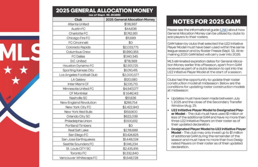 The release of 2025 MLS General Allocation Money figures gives fans and insiders a clear look at how prepared each club is to improve rosters before the 2026 season. With some clubs holding millions in GAM and others nearly tapped out, the next transfer windows promise to reshape the competitive balance of Major League Soccer.