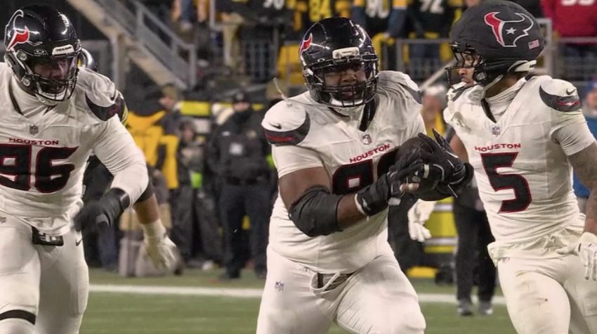 Sheldon Rankins returned a fumble by Aaron Rodgers 33 yards for a touchdown early in the fourth quarter to highlight a dominant performance by the NFL’s top-ranked defense, and the Houston Texans beat the Pittsburgh Steelers 30-6 on Monday night for the first road playoff win in franchise history.