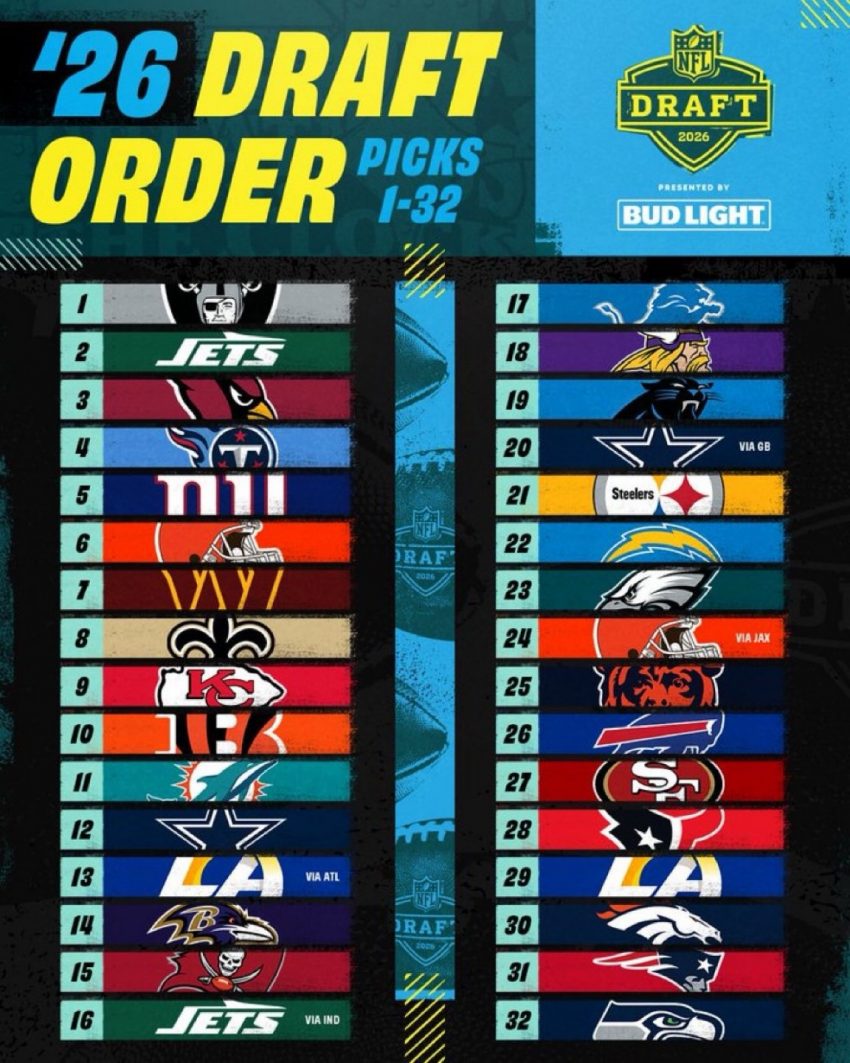 The Las Vegas Raiders, who finished with one of the league’s worst records at 3-14, earned the coveted No. 1 overall pick. This positions them perfectly to select a potential franchise quarterback or elite talent in a class loaded with intriguing prospects.