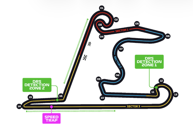The circuit features a mix of tight technical corners and long straights, making it a track that rewards both aerodynamic efficiency and strong braking performance.